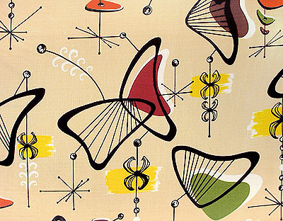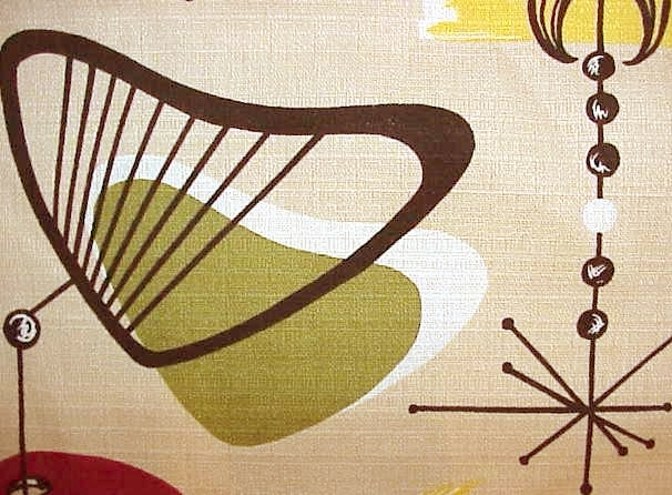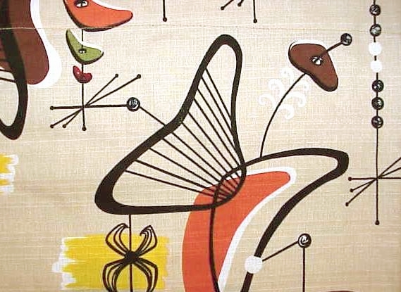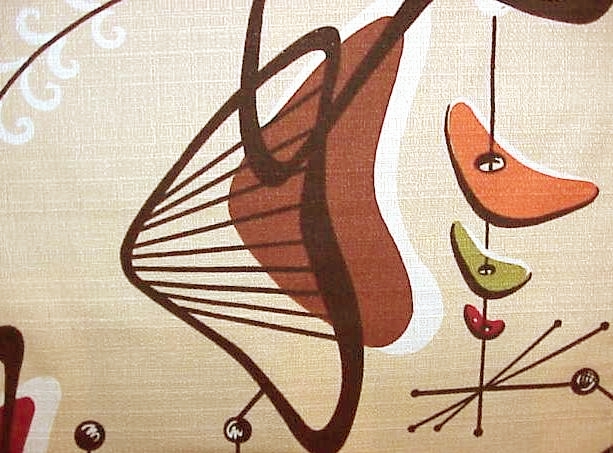 | Wow! This is the most nuclear of all atomic designs! Even has that wondrous "calder" feel! Everything mid-century has to offer! Stupendous vintage 50's palette of Cream, Black, Dark Red, Chocolate, Yellow, Olive, Terra Cotta Orange and French Vanilla! Larger shapes are about 5 1/2", sooo much fun for your mid-century fun house! Matching drapes, valance and pillows available. |