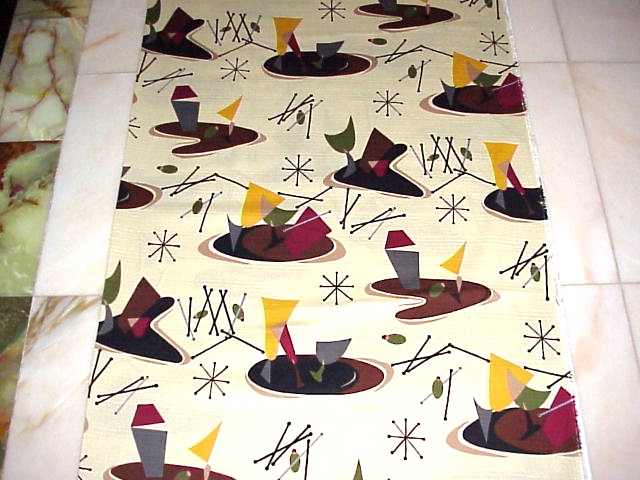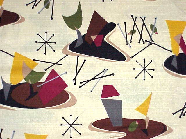 | Wow! This is the most space age of all atomic cocktail designs! Everything mid-century has to offer! Stupendous vintage palette of Ginger, Garnet, Palm, Cocoa Coffee, Pewter, Black, Vanilla. Larger drink glasses are about 4". Sooo much fun for your mid-century fun house! Matching drapes, valance and pillows available. Machine wash and dry. |